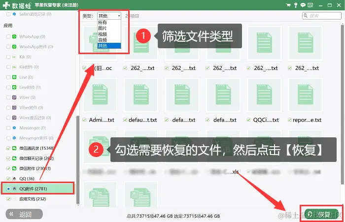 步骤3:软件将开始深度扫描您的设备,请耐心等待。当扫描完成后,打开【QQ附件】选择类型为【其他】,勾选需要恢复的文件,点击【恢复】。