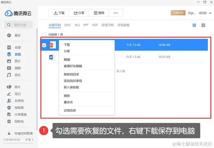 步骤2:跳转页面后即可看到之前上传的文件,选中文档后,右键下载保存到新文件夹就可以了。