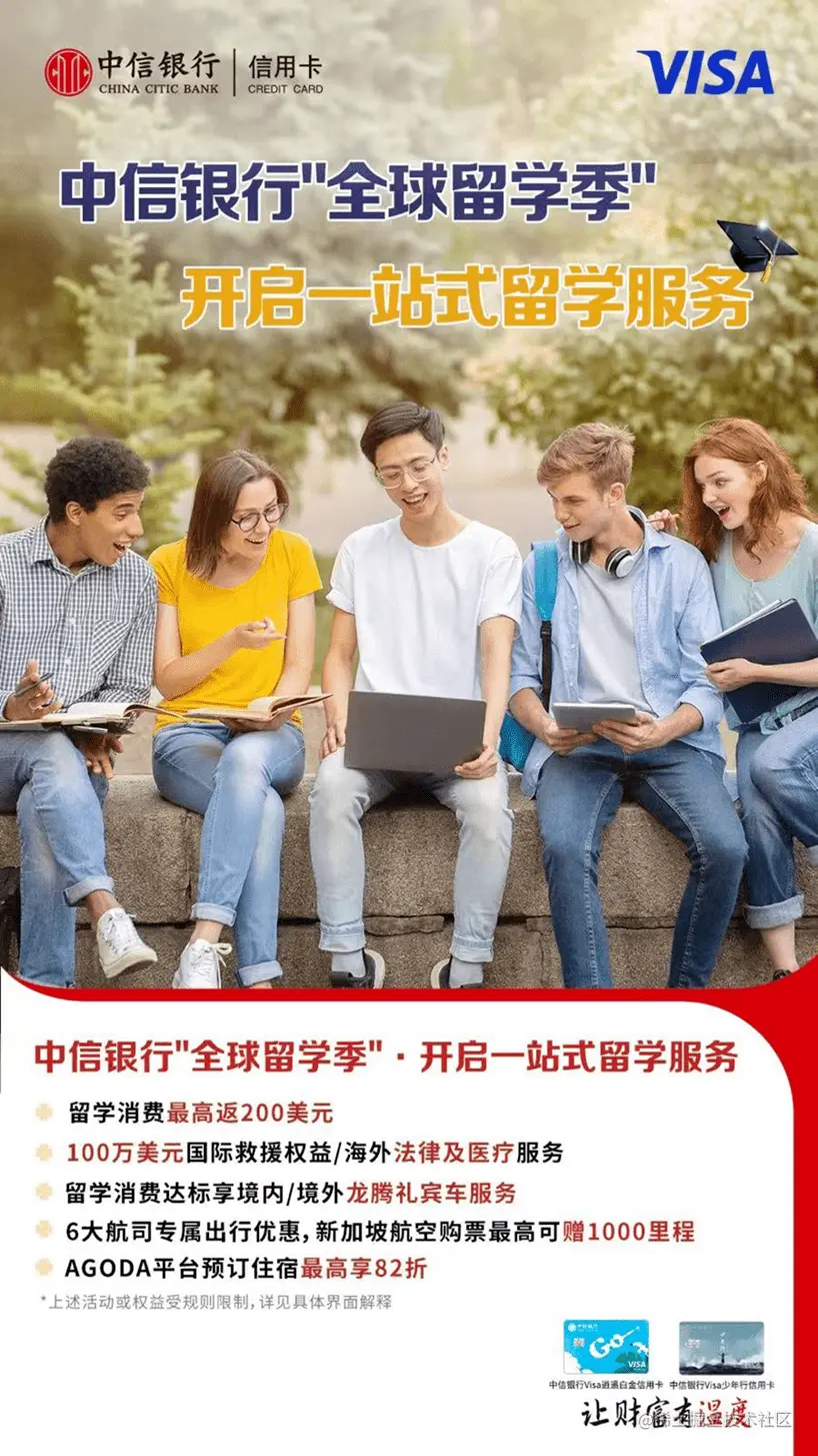 今年,随着留学相关考试的恢复、各大院校恢复线下课堂,出入境政策放开,中国留学市场回暖。对此,中信银行于今年3月针对留学家庭的金融服务需求,全新升级中信银行Visa逍遥白金卡,依托出国金融业务优势,打造覆盖留学上从出国到归国全旅程一站式金融服务,陪伴广大学子获享有温度的留学生活。与此同时,首次发行 “少年行”主题信用卡,面向私人银行和潜在私人银行客户子女推出,主打海外法律、海外医疗咨询服务,百万美金国际救援,留学缴费、留学生活消费返现,全球全币种免货币转换费等多种权益加持,涵盖留学准备、行前准备、留学生活各阶段需求,可作为多类主卡的附属卡,一拍即付,更方便、更快捷、更安全。