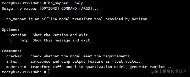 这个镜像是地平线官方提供的,里面已经装好了工具链环境,进入容器后可以首先用下面命令查看一下工具链环境是否正常: