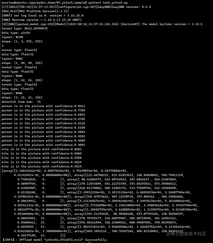 完了会在同级目录下生成一个 model_output 的文件夹,里面就包括了可以在直接地平线 BPU 上执行的 yolov5s_672x672_nv12.bin 模型文件,然后把这个模型文件拷贝到板子 (执行环境) 中的 /app/pydev_demo/models 目录下,然后使用如下命令执行推理: