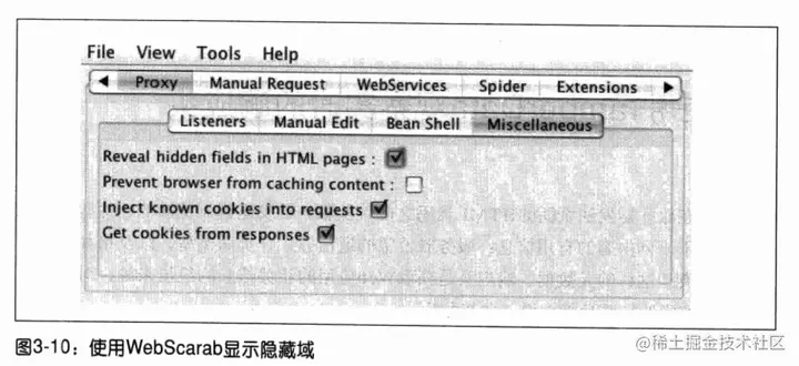 在WebScarab中,选择Proxy选项卡,然后选择该选项卡中的Miscellaneous窗格。选中标注着“Reveal hidden fields in HTML pages”的复选框,如图3-10所示。现在,浏览到某个带有隐藏表单域的网页。它们将显示为纯文本的输入框,如图3-11所示。