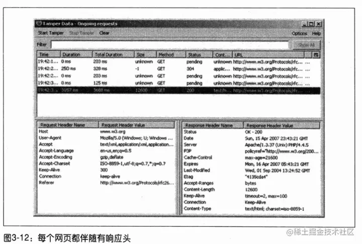 从“工具”菜单中打开TamperData,然后浏览到某个页面。在TamperData窗口中,你会发现它列举出了访问过的页面,这与WebScarab和FireBug是一样的。单击某个页面,就会显示出请求头和响应头,如图3-12所示。