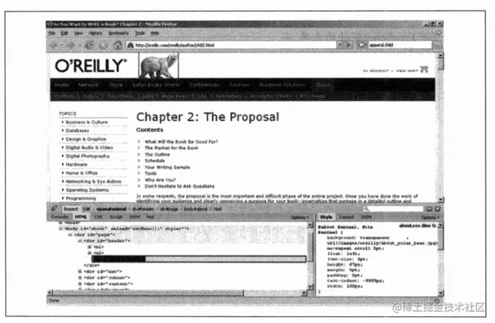 在Firebug中找出特定元素是很容易的。你的也可以在HTML选项卡中浏览,直到找到该元素,或者按Inspect按钮并在浏览器和Firebug的HTML显示中高亮显示这个元素。这个方法也适用于CSS和DOM属性,不过你必须手动选择要修改的属性。图3-14显示了这种高亮显示,请亲自试验一下,确实相当直观。