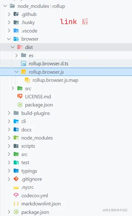 可以看到 执行yarn link后多出来一个node_modules目录而且是通过软链接链接到link_moudle