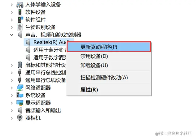- 在【声音、视频和游戏控制器】下,找到声卡驱动程序,右键点击并选择 【更新驱动程序】。