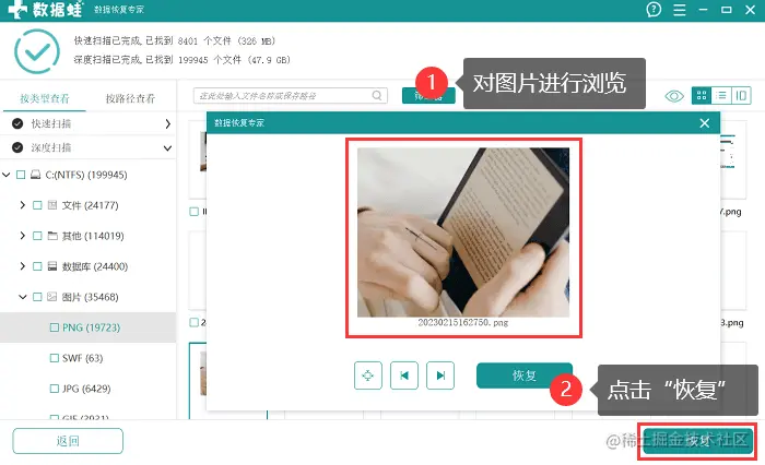 3.深度扫描之后,能被恢复的文件都会被扫描到,此时文件数量过多,建议再次使用 【筛选器】 对文件进行筛选,找到目标图片后,可放大浏览后点击 【恢复】 。