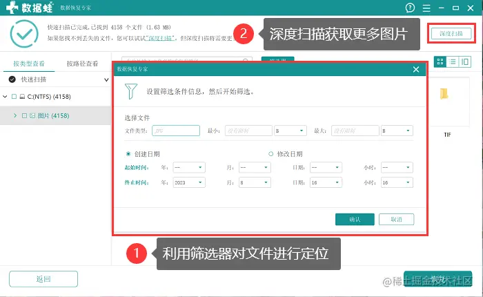 2.扫描结果出来后,如果有对文件命名,可以搜索图片的名称,如果没有命名,可以根据图片的类型进行查看,也可以利用【筛选器】 对图进行查找,若没有找到需要恢复的图片,按下【深度扫描】 按钮;