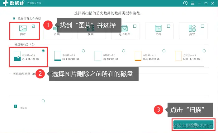 1.点击 【免费扫描】后进入软件中,如果是要进行照片的恢复,在文件类型下找到 【图片】 ,然后选择图片删除之前所在的磁盘,(如果是外部设备,连接电脑后会在【可移动驱动器】 中显示)点击 【扫描】 ;