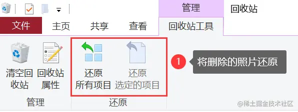 2.如果回收站中都是需要恢复的照片,单击 【还原所有项目】,如果文件很多,也可以选择要恢复的照片,点击【还原选定的项目】 。