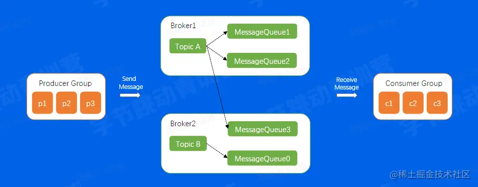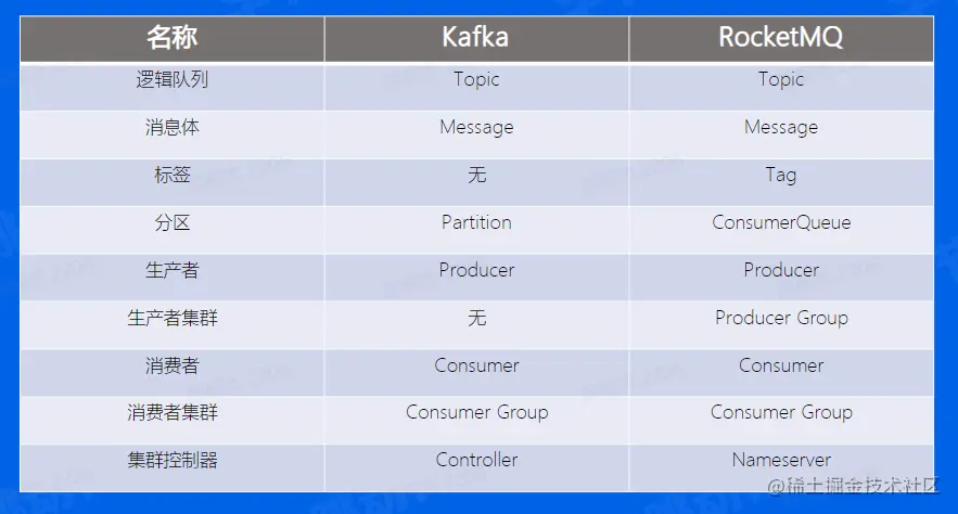 根据我们刚刚的介绍,可以看到Producer,Consumer,Broker这三个部分,Kafka和RocketMQ是一样的,而Kafka中的Partition概念在这里叫做ConsumerQueue