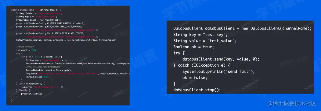 - 第三步:引入对应语言的SDK,配置好集群和Topic等参数,初始化一个生产者,调用Send方法,将你的Hello World发送出去