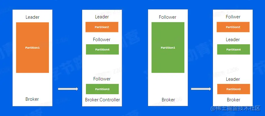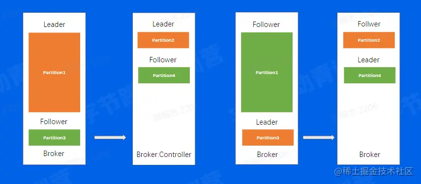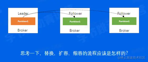 这个场景当中,同一个Topic有4个分片,两副本,可以看到,对于分片1来说,数据量是明显比其他分片要大的,当我们机器IO达到瓶颈的时候,可能就需要把第一台Broker上面的Partition3迁移到其他负载小的Broker上面,接着往下看