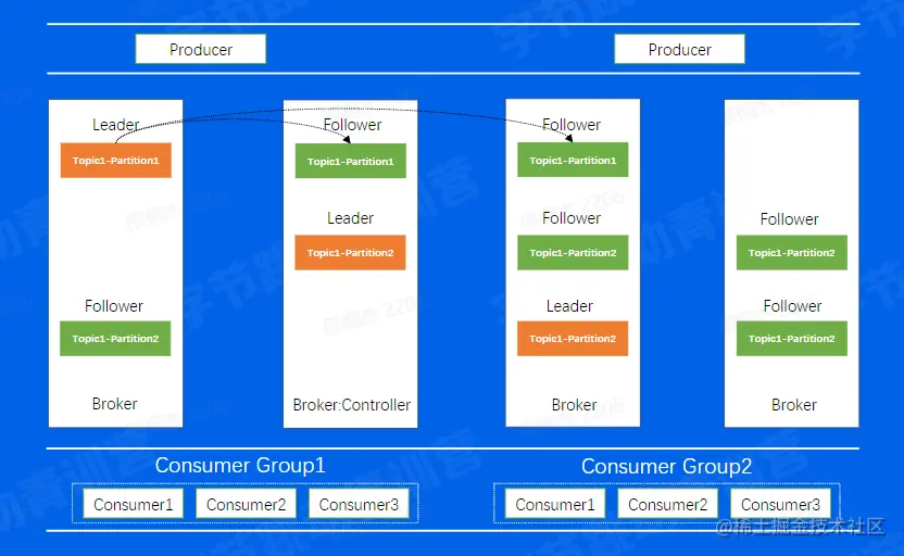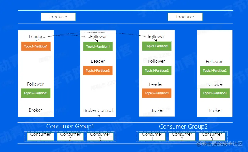 图中Broker代表每一个Kafka的节点,所有的Broker节点最终组成了一个集群。 图中整个集群,包含了4个Broker机器节点,集群有两个Topic,分别是Topic1和Topic2,Topic1有两个分片,Topic2有1个分片,每个分片都是三副本的状态。这里中间有一个Broker同时也扮演了Controller的角色,Controller是整个集群的大脑,负责对副本和Broker进行分配。