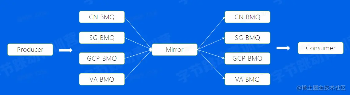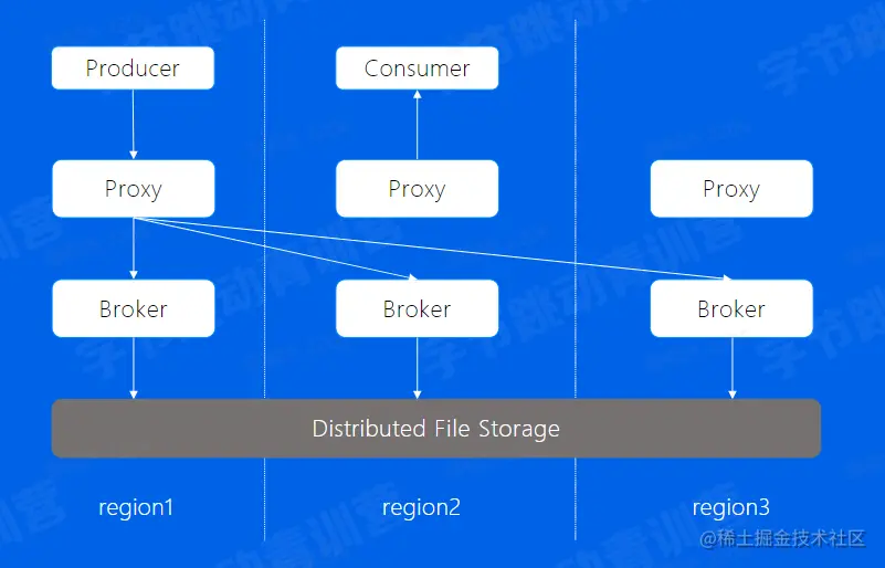 那我们来看看BMQ的多机房部署是怎么做的:Proxy -> Broker -> Meta -> HDFS