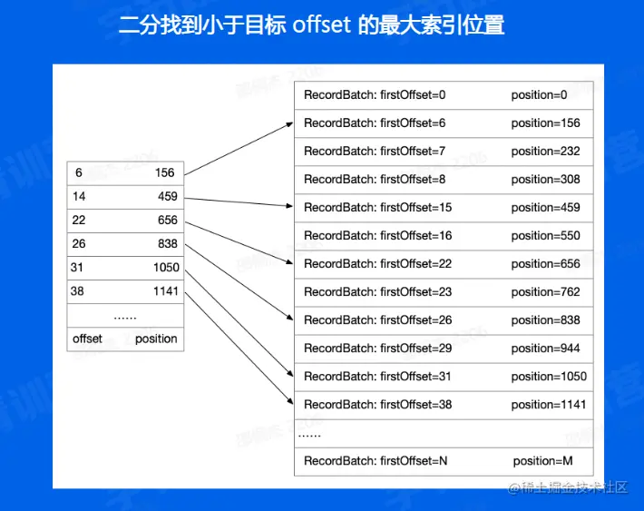 通过二分找到小于目标offset最大的索引位置,再遍历找到目标offset