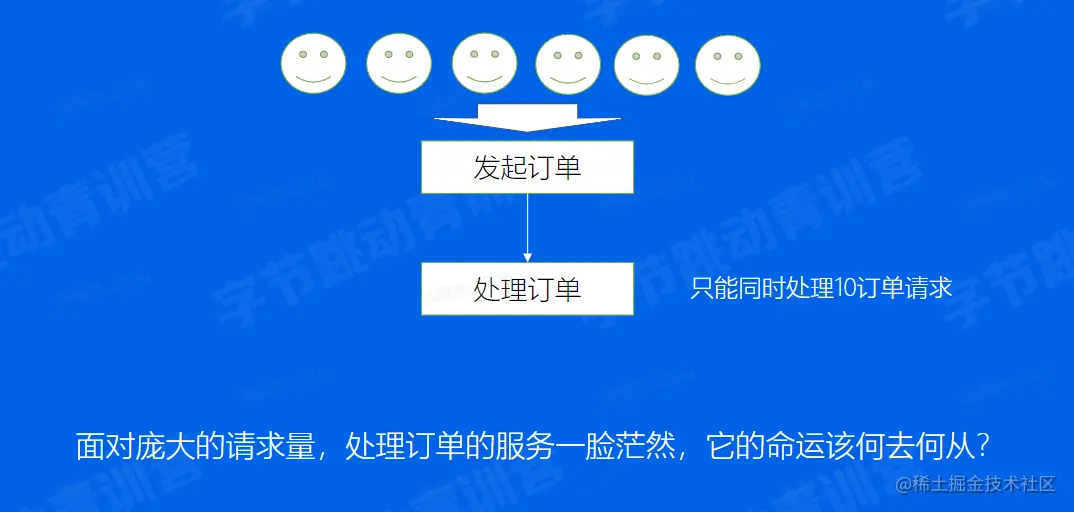 可以看到,一堆人都发起了订单请求,可是公司给的预算不够,服务器的配置太弱,订单服务只能同事处理10个订单请求。