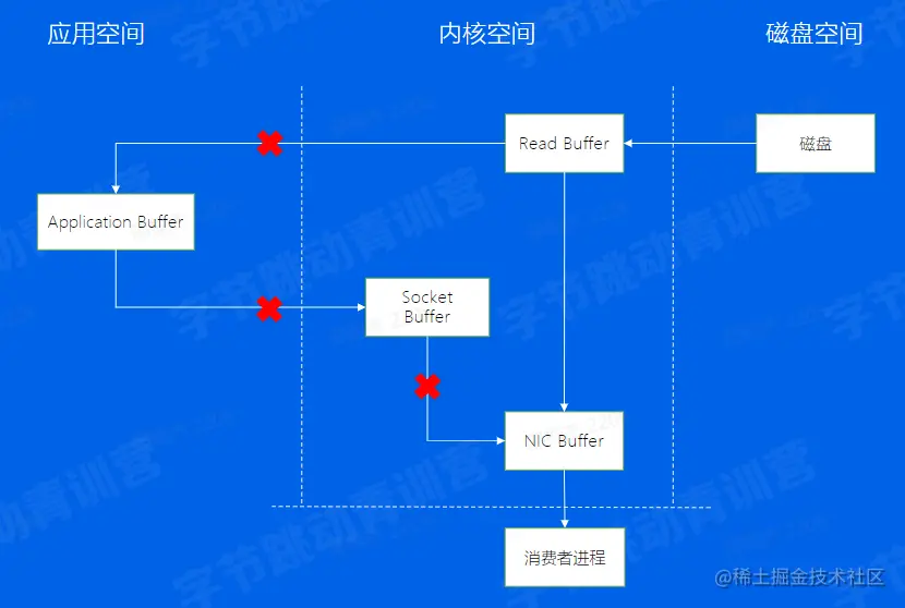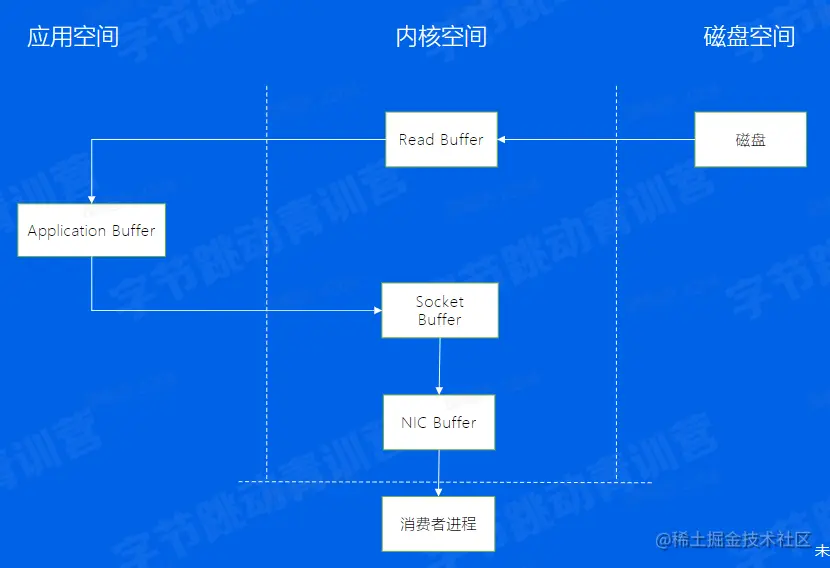 Consumer从Broker中读取数据,通过sendfile的方式,将磁盘读到os内核缓冲区后,直接转到socket buffer进行网络发送 Producer生产的数据持久化到broker。