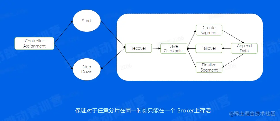其实对于写入的逻辑来说,我们还有一个状态机的机制,用来保证不会出现同一个分片在两个Broker上同时启动的情况(脑裂),另外也能够保证一个分片的正常运行。