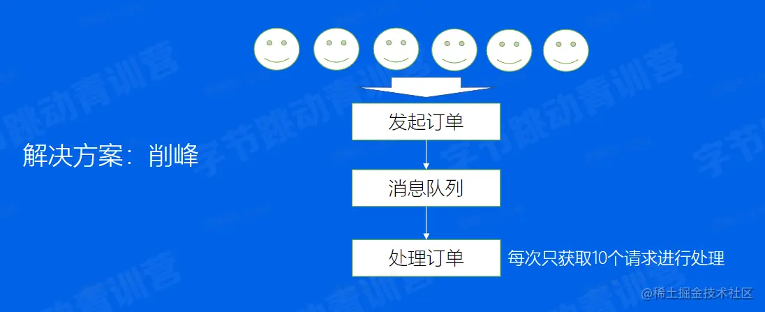 - 削峰:控制同时处理的量,将某一段时间的超高流量分摊到更长的一段时间内去消化,避免了流量洪峰击垮系统。