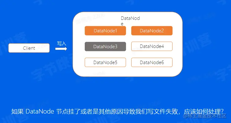 我们之前说到了,建立一个新的文件,会随机挑选与副本数量相当的数据节点进行写入,那如果此时我们挑选节点中有一个出现了问题,导致不能正常写入了,我们应该怎么处理,是需要在这里等着这个节点恢复吗,当然不行,谁知道这个节点什么恢复,既然你不行,那就把你换了,可以重新找正常的节点创建新的文件进行写入,这样也就保证了我们写入的可用性