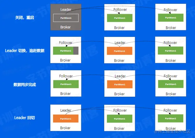 ISR:意思是同步中的副本,对于Follower来说,始终和leader是有一定差距的,但当这个差距比较小的时候,我们就可以将这个follower副本加入到ISR中,不在ISR中的副本是不允许提升成Leader的