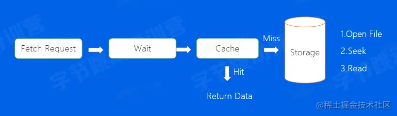 首先Consumer发送一个Fetch Request,然后会有一个Wait流程,那么他的作用是什么呢: 想象一个Topic,如果一直没有数据写入,那么,此时consumer就会一直发送Fetch Request,如果Consumer数量过多,BMQ的server端是扛不住这个请求的,因此,我们设置了一个等待机制,如果没有fetch到指定大小的数据,那么proxy会等待一定的时间,再返回给用户侧,这样也就降低了fetch请求的IO次数。 经过我们的wait流程后,我们会到我们的Cache里面去找到是否有存在我们想要的数据,如果有直接返回,如果没有,再开始去存储系统当中寻找,首先会Open这个文件,然后通过Index找到数据所在的具体位置,从这个位置开始读取数据