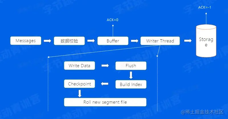 校验完成后,会把数据放入Buffer中,通过一个异步的Write Thread线程将数据最终写入到底层的存储系统当中。