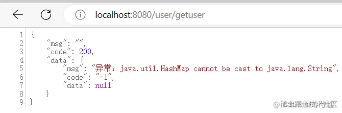 以上方法表示,如果出现了异常就返回给前端⼀个 HashMap 的对象,其中包含的字段如代码中定义的那样。 我们可以针对不同的异常,返回不同的结果。