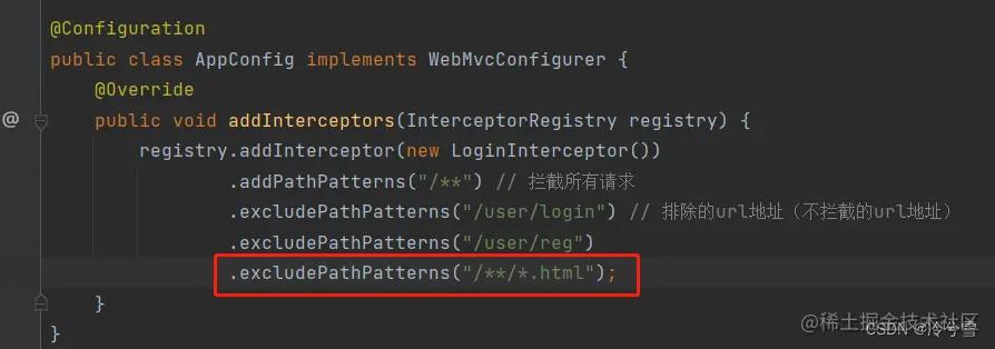 - 将自定义拦截器加入WebMvcConfigurer 的 addInterceptors 方法中。