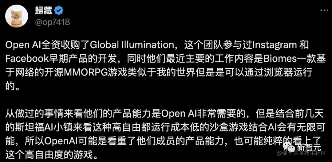 还有人认为,从 Global Illumination 做过的事情来看。他们的产品能力是 OpenAI 非常需要的,但是结合前几天的斯坦福 AI 小镇来看,这种高自由度运行成本低的沙盒游戏结合 AI 会有无限可能,所以 OpenAI 可能是看重了他们成员的产品能力,也可能纯粹的看上了这个高自由度的游戏。