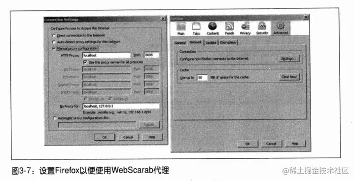 WebScarab需要你调整Firefox设置,如图3-7所示。一旦将其配置好用于截获数据,它就可以用在本章所有的秘诀中。它的功能如此强大,我们强烈推荐你使用它。