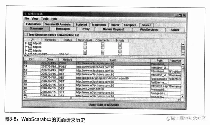3.切换到WebScarab,你应该会看到若干个条目显示这你最近的几个页面请求。