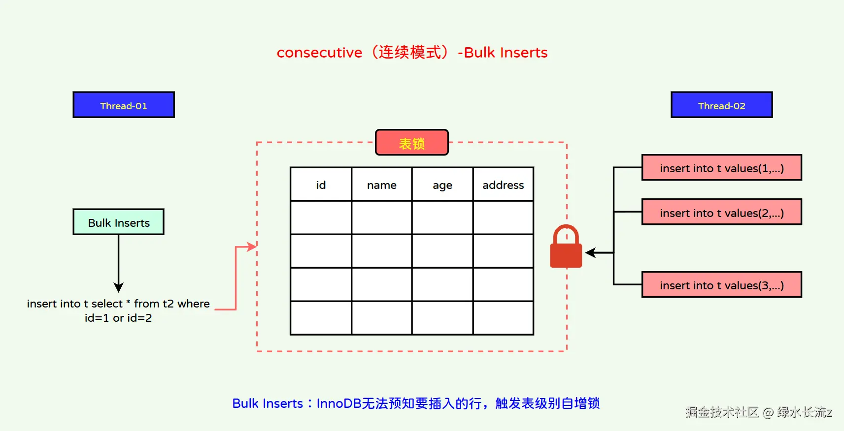 - 2:interleaved(交叉模式):不采用表锁,来一个insert处理一个,并发能力最高,但可能会造成insert分配的id顺序不一致;