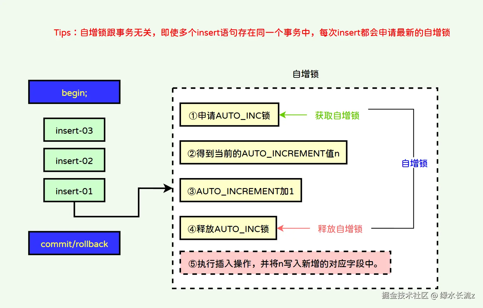 Tips:自增锁跟事务无关,即使多个insert语句存在同一个事务中,每次insert都会申请最新的自增锁来获取最新的AUTO_INCREMENT值;获取到自增值后释放,而不是事务结束释放;