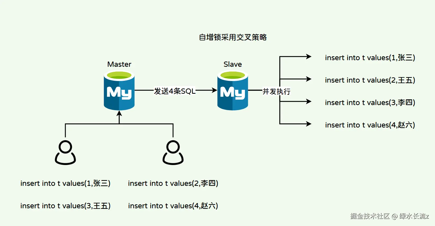 由于交叉模式中,所有的客户端线程都可以同时获取自增锁,因此该模式可能会出现id不连续问题。在搭建有MySQL主从复制的架构并且binlog日志格式为SBR时会出现主从数据不一致问题;