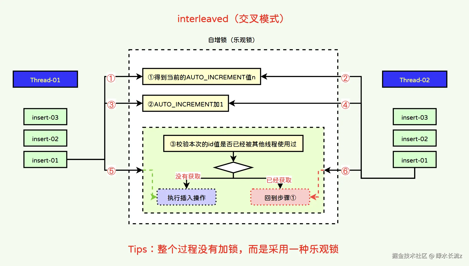 步骤⑥:Thread-02线程校验id值是否被其他线程获取过,校验结果:已经被其他线程获取过,重新回到自增锁步骤①;