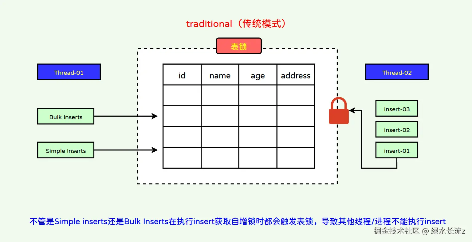 在传统模式下,不管是在执行Simple inserts还是Bulk inserts时每个insert获取自增锁时都会触发表锁,在某个insert没有释放表锁之前其他线程/进程均不可获取自增锁;虽然传统模式保证了多个insert插入的连续性但实际上并发插入属于串行化,性能较低;