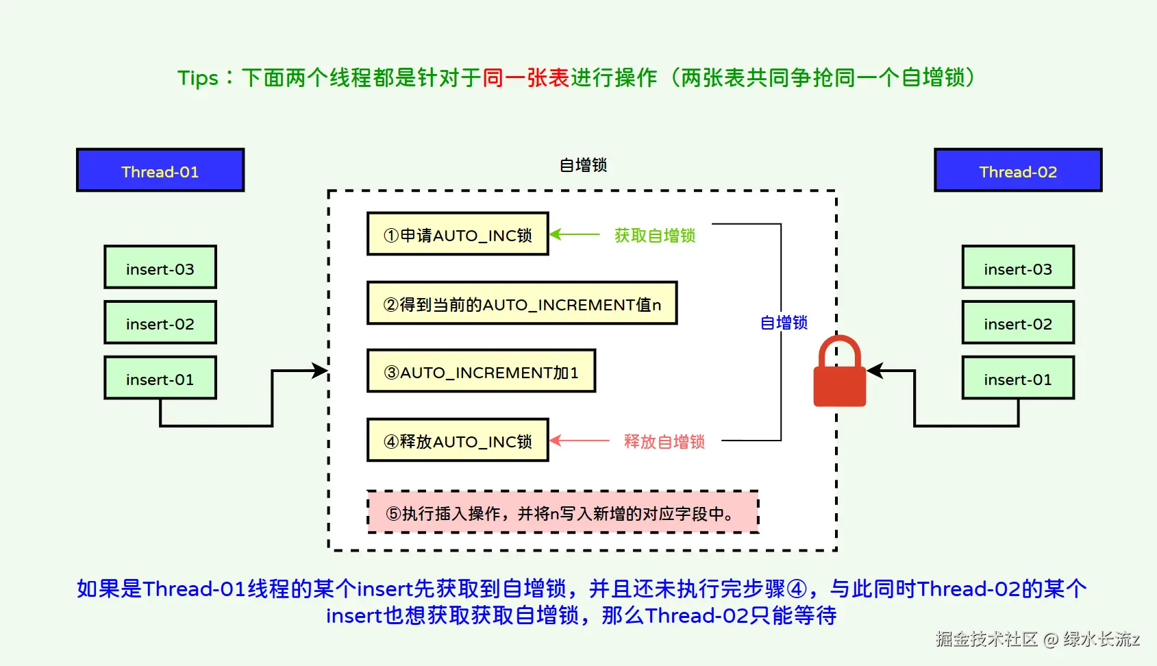 Tips:再次说明,自增锁是执行insert时获取auto_increment值时才会申请,获取到auto_increment值时就会立即释放,跟事务无关;