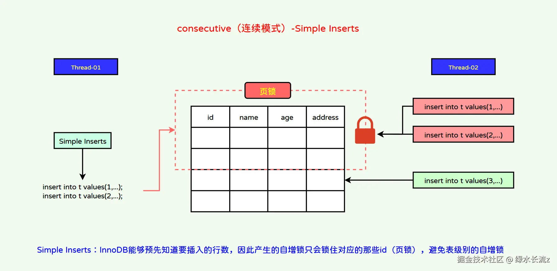 - Simple inserts:InnoDB能够预先知道要插入的行数,因此产生的自增锁只会锁住对应的那些id(页锁),避免表级别的自增锁