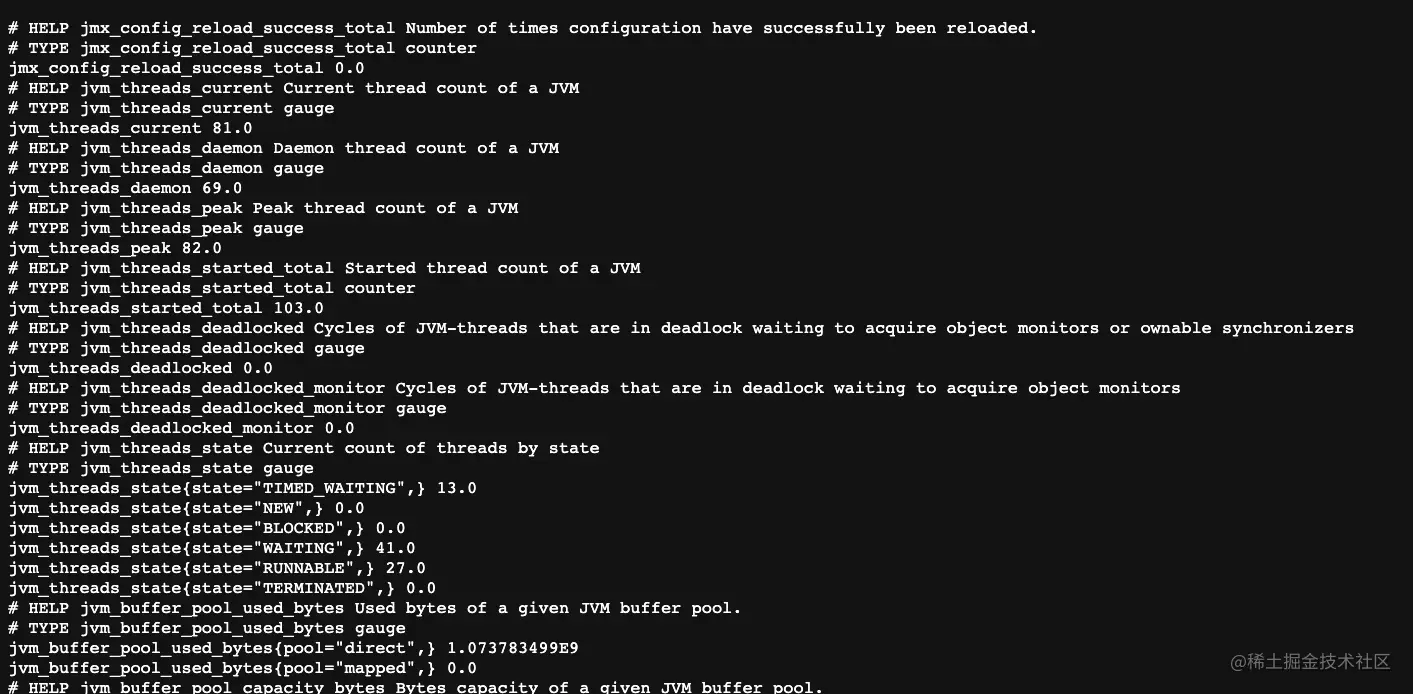 使用 JMX Exporter 提供的 JVM 进程内启动(in-process)方式暴露 JVM 的监控指标。在 JVM 启动时指定参数,通过 javaagent 的形式运行 JMX-Exporter 的 jar 包,进程内读取 JVM 运行时状态数据,转换为 Prometheus metrics 格式,并暴露端口让 Prometheus 采集。