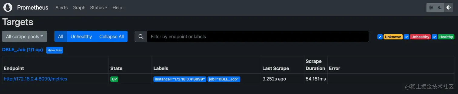进入 Prometheus 容器并修改配置,创建 DBLE_Job ,添加 target:172.18.0.4:8099。