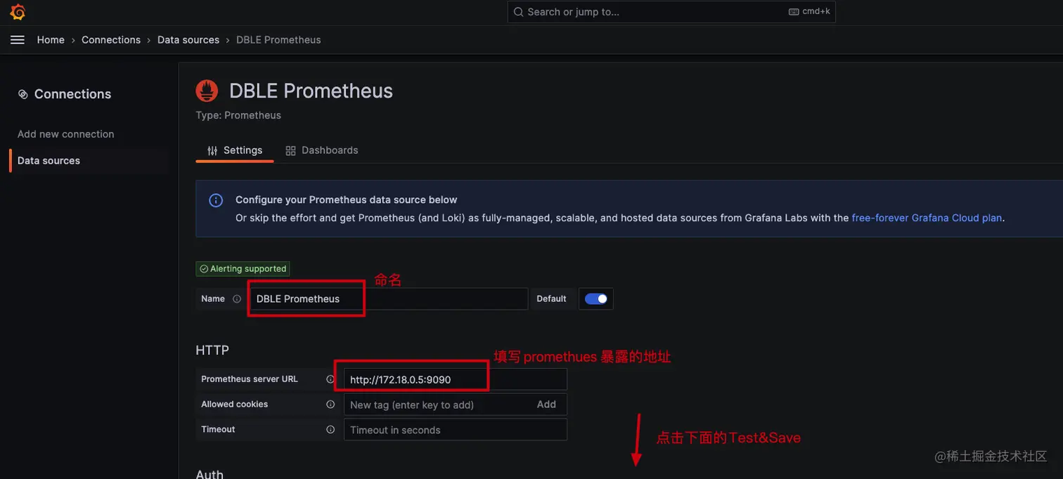 注意:填写 Prometheus 容器 IP: http://172.18.0.5:9090 并且保存。
