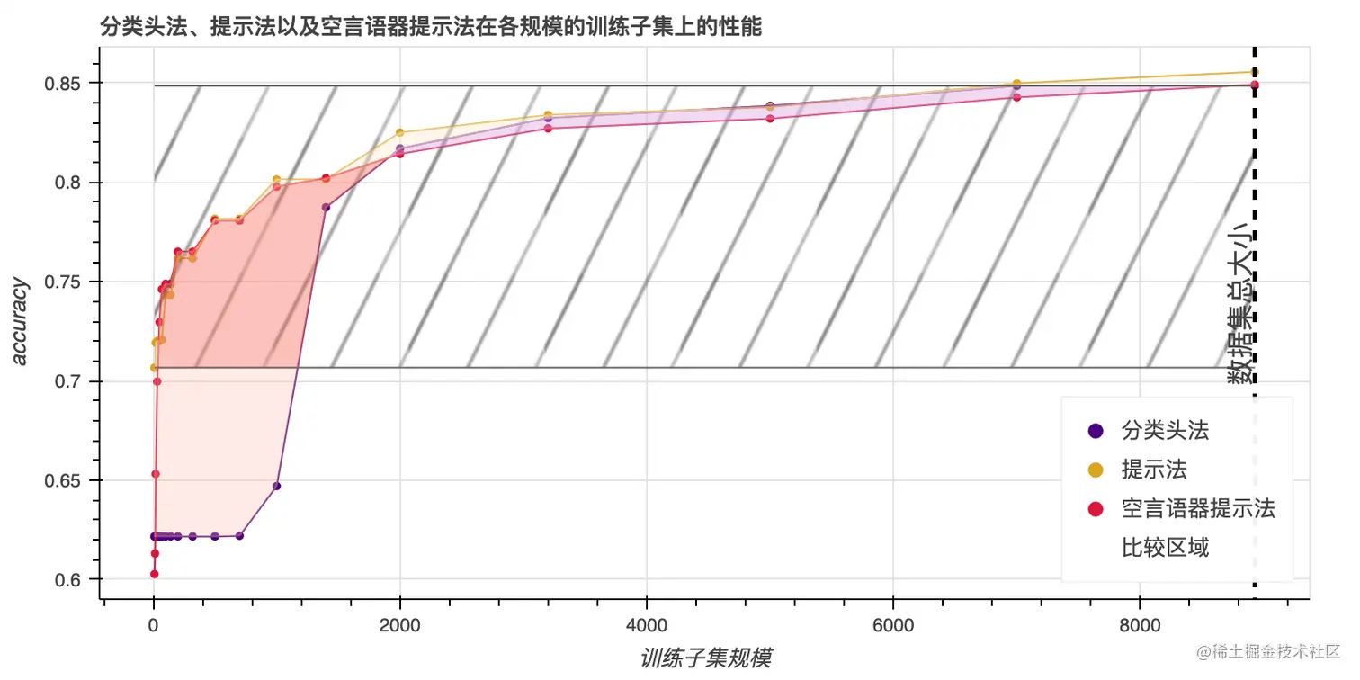 数据点(data points)通常用于描述单个信息单位或观测值,在本文中,它被用来量化“提示词”方法相对于传统方法的效率和效果。文章比较了两种训练(微调)机器学习模型的方法:一种是使用提示 (prompts),本文也称之“提示词”,另一种是使用传统的分类器头 (classifier heads),本文也称之为“分类头”。通过比较可以发现,使用提示词的方法通常比使用分类器头的方法更好。