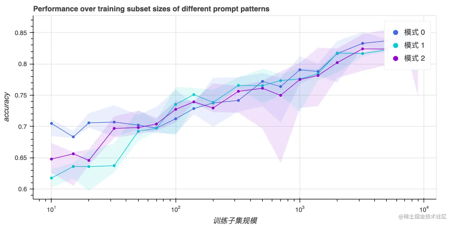 另一个可能影响提示法在零样本分类场景下的成败的因素是:提示模板的选择。这里,我们看一下该因素对我们的影响。我们复用了 PET 中的模板(每个任务有两到三个完全不同的模板),并对每个任务的每种模板进行了实验,结果如下。我们可以看到提示的选择对结果没有显著影响,其方差小于随机种子带来的方差。