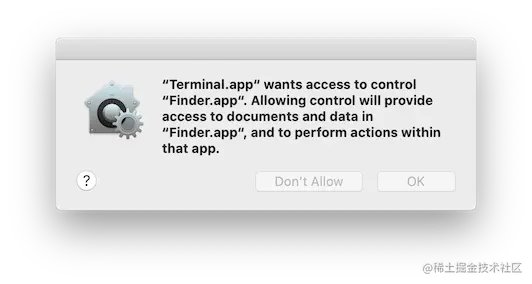 使用 osascript 从 shell 向另一个进程发送事件时,可以从终端触发安全审批:
