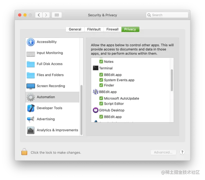 自 macOS Mojave 以来,安全和隐私控件限制了 AppleEvents 的发送和接收。特定进程只能在获得用户批准后才能向不同进程发送事件。用户可以在 "安全与隐私 "偏好窗格的 "隐私 "选项卡中管理应用程序间的审批。
