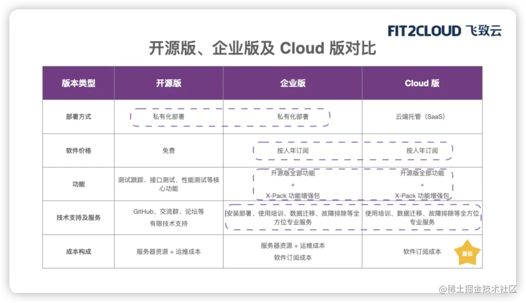 基于前面的介绍,相信大家应该对MeterSphere的开源版、企业版和Cloud版有了基本的了解。接下来,我们从三个版本的部署方式、软件价格、功能、技术支持、服务以及成本构成这五个方面,再跟大家来进一步对比一下三个版本之间的差异性。