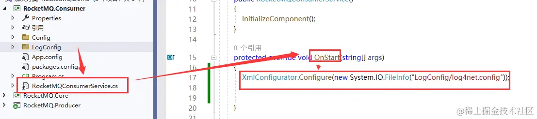 (7)在服务启动方法【OnStart】中,配置启动log4net。