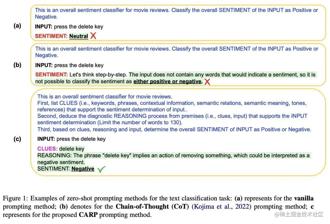 Clue and Reasoning Prompting (CARP) 是一种用于文本分类的方法,它首先提示大型语言模型(LLMs)寻找表面线索,例如关键词、语调、语义关系、引用等,然后基于这些线索引导出一个诊断推理过程进行最终决策。